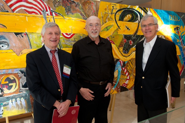 (left) Jeff Bingaman former US Senator, NM; Michael Killen, Artist; James Sweeney, Director, Precourt Energy Efficiency Center, Stanford; Painting “Resilience” (24 x 5 feet) Michael Killen
