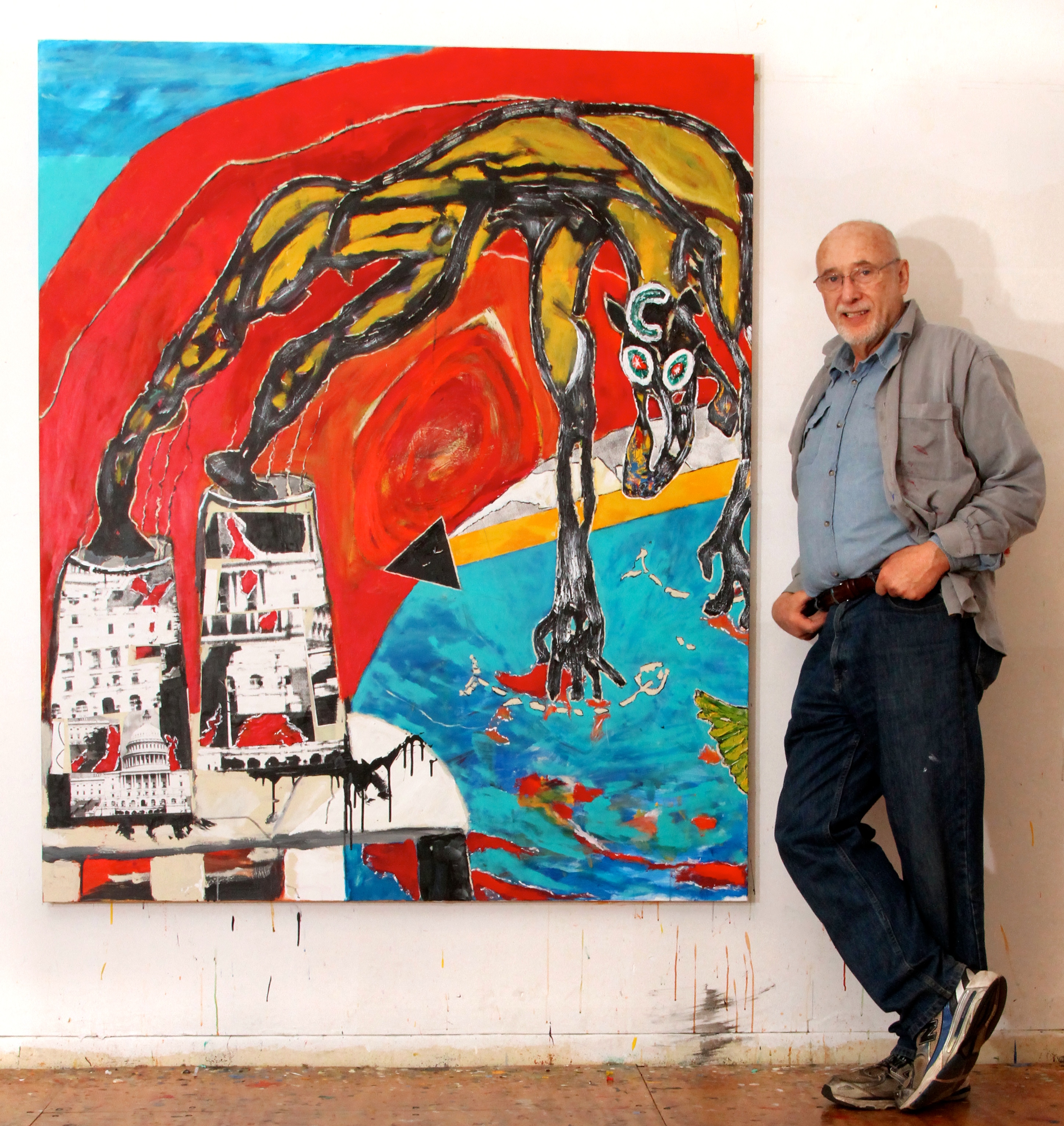 Michael Killen, Artist and Filmmaker says he made the (15 x 6 feet) painting ‘Don Quixote Meets Ocean Change & Fights Carbon Dioxide’ to help raise level of discussion of the treat of carbon emissions to all who depend on the ocean food chain for commerce, food, jobs, investments, property values, sports and taxes.