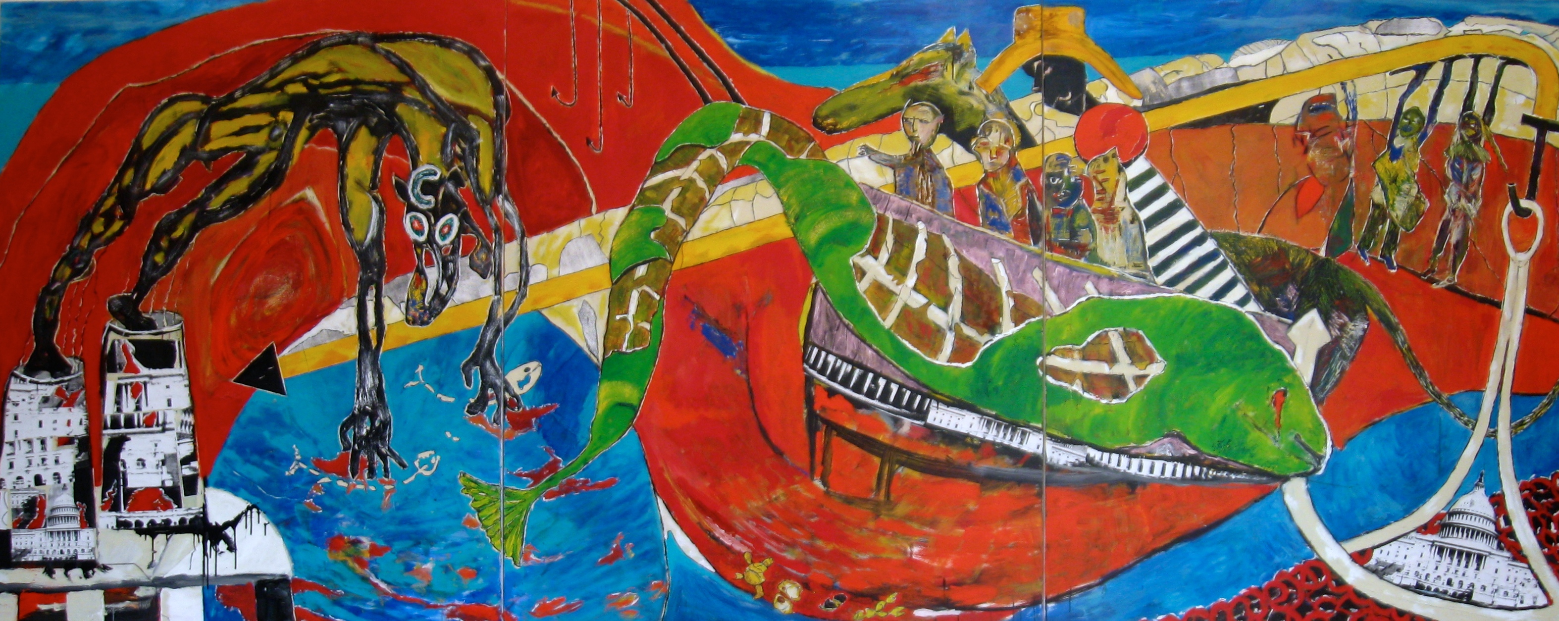 Michael Killen, America Artist and Filmmaker, and former business think tank president said he made the ‘Don Quixote Meets Ocean Change’ (15 x 6 feet) painting that debuted at a US government agency recently, to being attention to those who are dependent on the US fishing and seafood industries for their livelyhood and wealth that their industry will be first to be impacted adversely by ocean change that is caused by carbon emissions.
