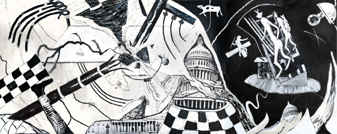 Michael Killen, Silicon Valley artist, speaker and filmmaker created the ‘Dire Consequences: Send in the Clowns series of large scale paintings. The series consists of three 15’ x 6’ paintings, each of which addresses a consequence of the carbon and methane emissions. A fourth painting shares how, people may feel, when they realize the clowns have already been called. That painting is ‘Knock, Knock, Knocking on Heaven’s Door’ (6’ x 5 ).