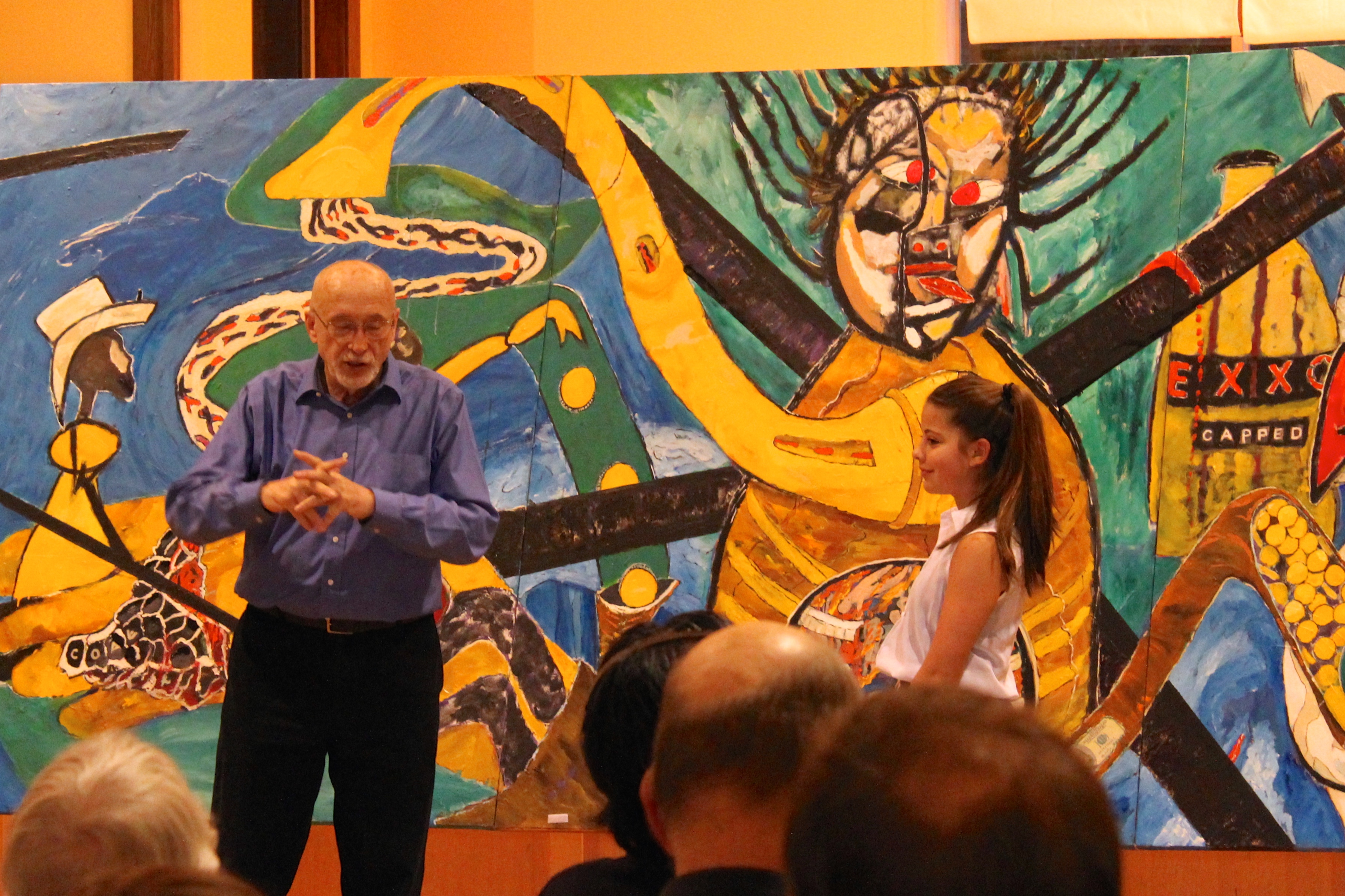 Michael answering a 10 year old girl’s question in front of one of the paintings displayed at the Arts at St. Bede’s event.