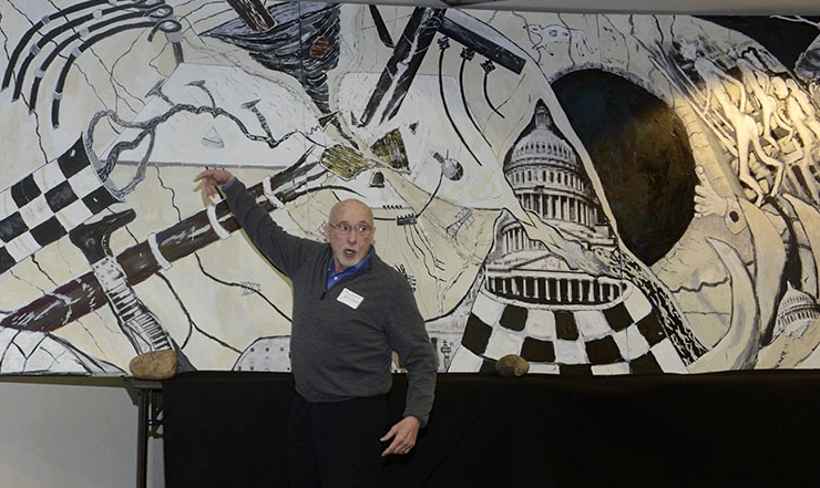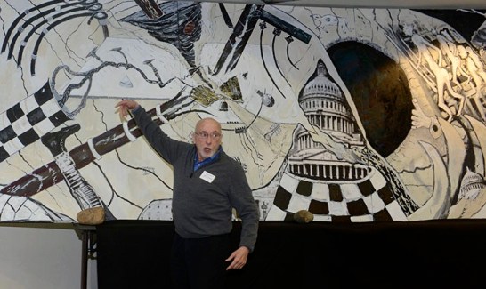 Michael speaking at USGS event with his painting ‘Gone With the Wind is the Electric Grid’