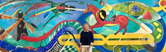 Katharina Powers, Director, Art Ventures Gallery, Menlo Park, CA, in front of the painting ‘Don Quixote, Tilts at Climate Change’ (5′ x 15′)