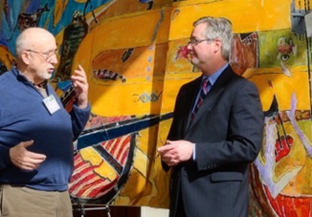 Michael Killen (left) and Tom McGinty (right), National Deputy Director for U.S. Operations at the U.S. Department of Commerce, in front of the painting ‘Resilience of America,’ in the lobby of the Santa Clara CA Conference Center